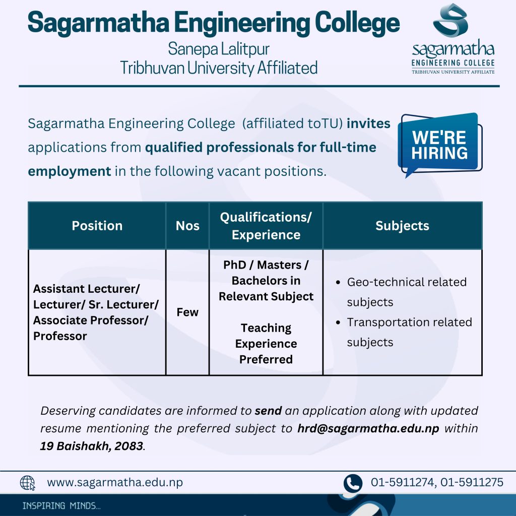 Deserving candidates are requested to send an application along with an updated resume and a passport sized photo to hrd@sagarmatha.edu.np no later than 19th Baishakh, 2083.